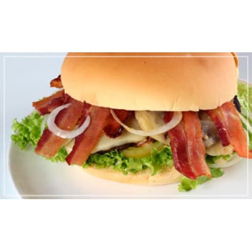 Delicioso hambúrguer de contra filé. pão, maionese, mostarda, ketchup, alface, tomate, cebola, bacon, 210g de hambúrguer de contra filé e mussarela.